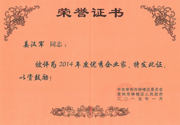公司榮獲常州市“工業四星企業”的榮譽稱號,公司董事長兼總經理姜漢軍被常州市委、市政府授予“常州市明星企業家”的榮譽稱號。